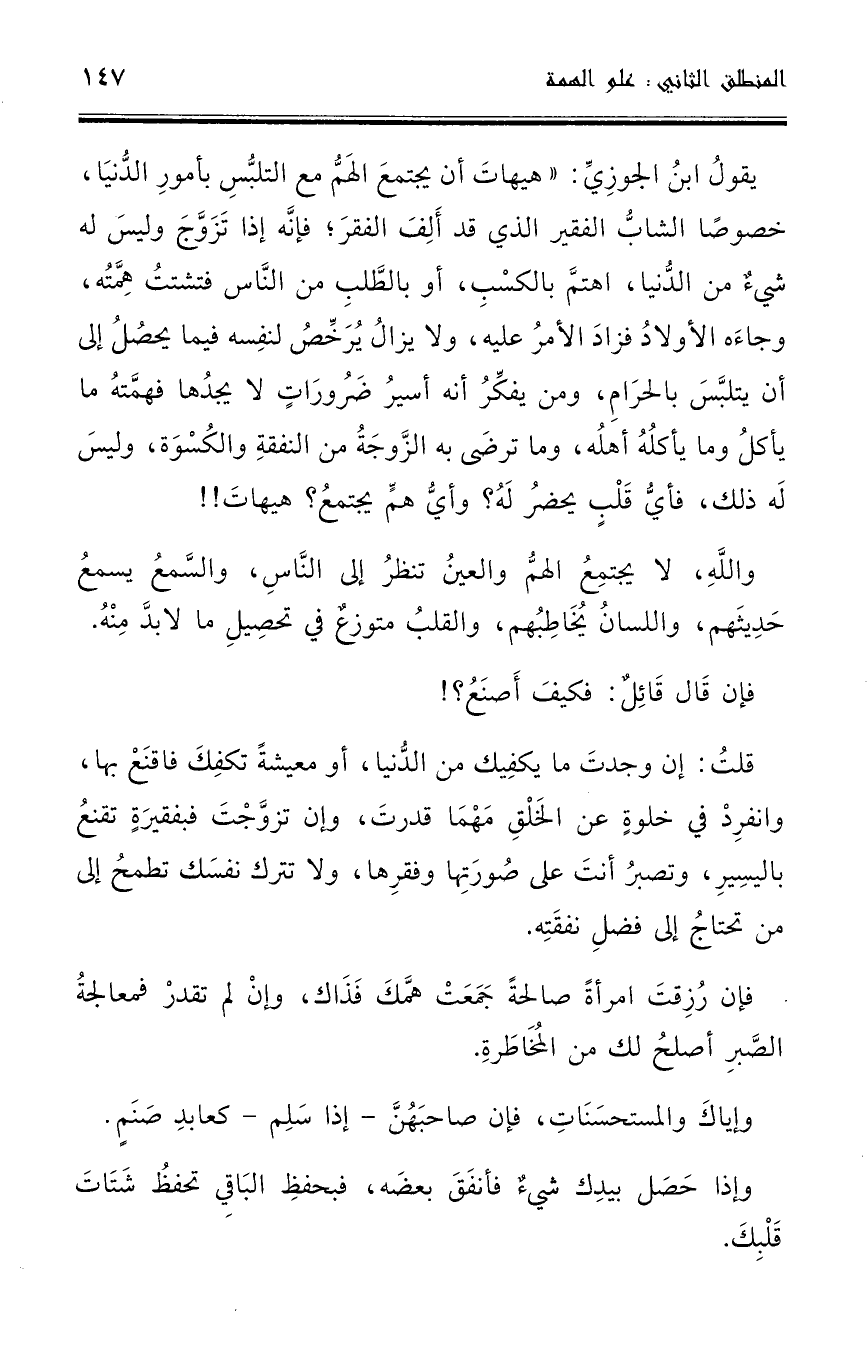 يقول ابن الجوزي: " هيهات أن يجتمع الهم مع التلبس بأمور الدنيا، خصوصًا الشاب الفقير الذي قد أَلِفَ الفقر؛ فإنَّه إذا تزوج وليس له شيء من الدنيا، اهتم بالكسب، أو بالطلب من الناس فتشتت همته، وجاء هـ الأولاد فزاد الأمر عليه، ولا يزال يرخص لنفسه فيما يحصل إلى أن يتلبس بالحرام.، ومن يفكر أنَّه أسير ضرورات لا يجدها فهمته ما يأكل وما يأكله أهله، وما ترضى به الزوجة من النفقة والكسوة، وليس له ذلك، فأي قلب يحضر له؟ وأيُّ هم يجتمع؟ هيهات!!