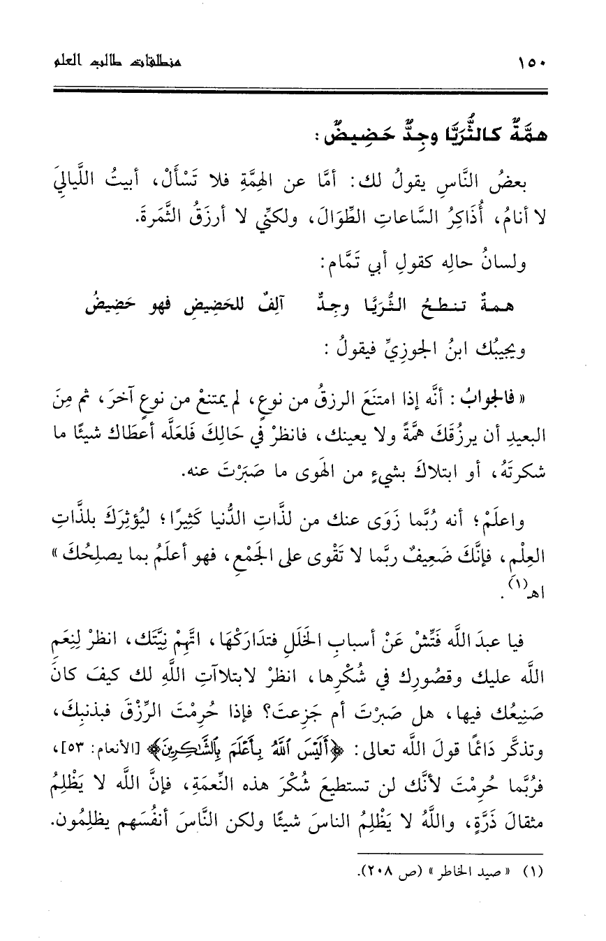 فالجواب: أنه إذا امتنع الرزق من نوع، لم يمتنع من نوع آخر، ثمَّ من البعيد أن يرزقك همَّة ولا يعينك، فانظر في حالك فلعله أعطاك شيئًا ما شكرته، أو ابتلاك بشيء من الهوى ما صبرت عنه.