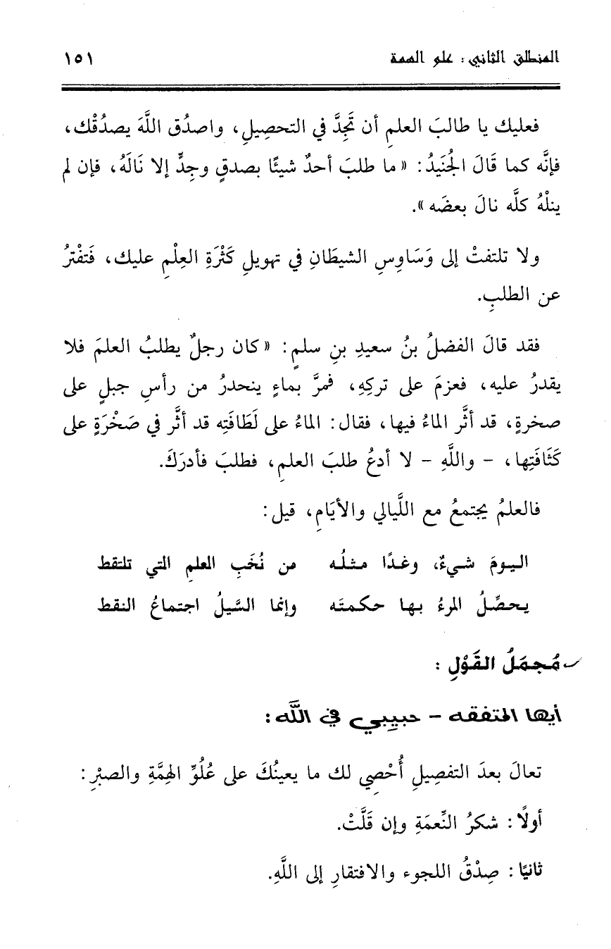 فقد قال الفضل بن سعيد بن سلم: " كان رجل يطلب العلم فلا يقدر عليه، فعزم على تركه، فمر بماء ينحدر من رأس جبل على صخرة، قد أثر الماء فيها، فقال: الماء على لطافته قد أثر في صخرة على كثافتها، ـ والله ـ لا أدع طلب العلم، فطلب فأدرك.