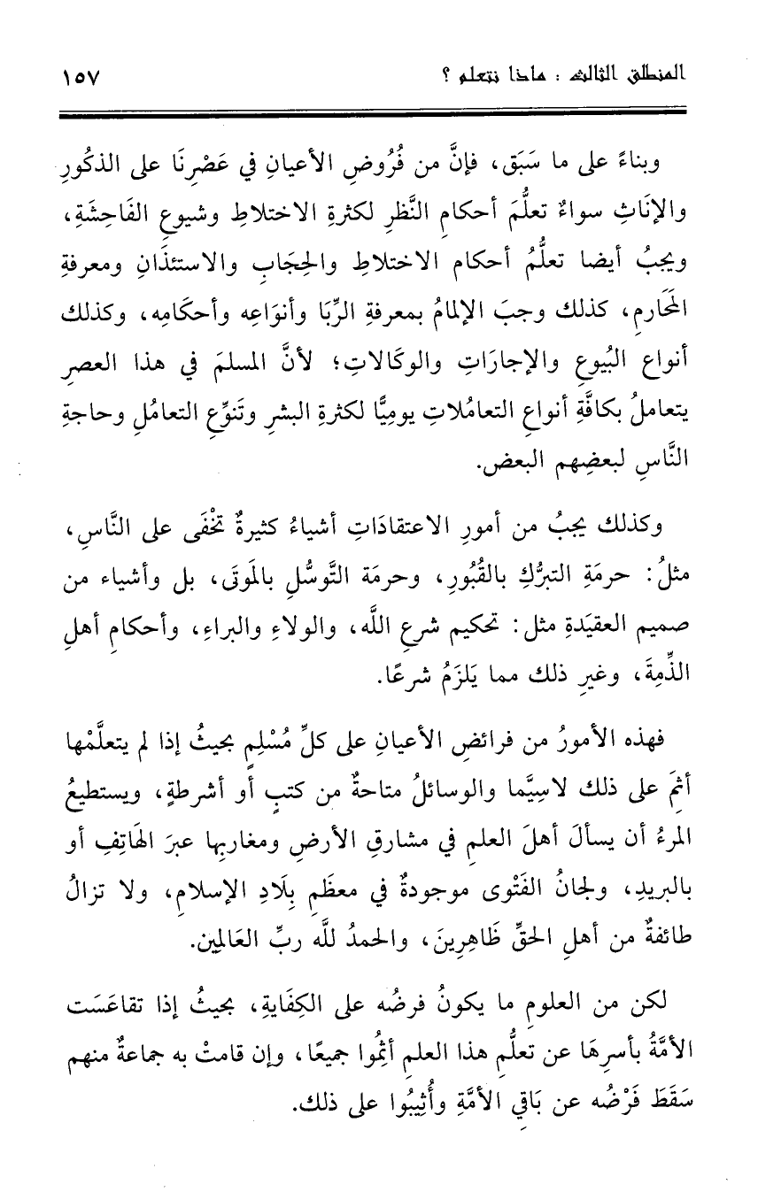 فهذه الأمور من فرائض الأعيان على كل مسلم بحيث إذا لم يتعلمها أثم على ذلك لاسيما والوسائل متاحة من كتب أو أشرطة، ويستطيع المرء أن يسأل أهل العلم في مشارق الأرض ومغاربها عبر الهاتف أو بالبريد، ولجان الفتوى موجودة في معظم بلاد الإسلام، ولا تزال طائفة من أهل الحق ظاهرين، والحمد لله رب العالمين.