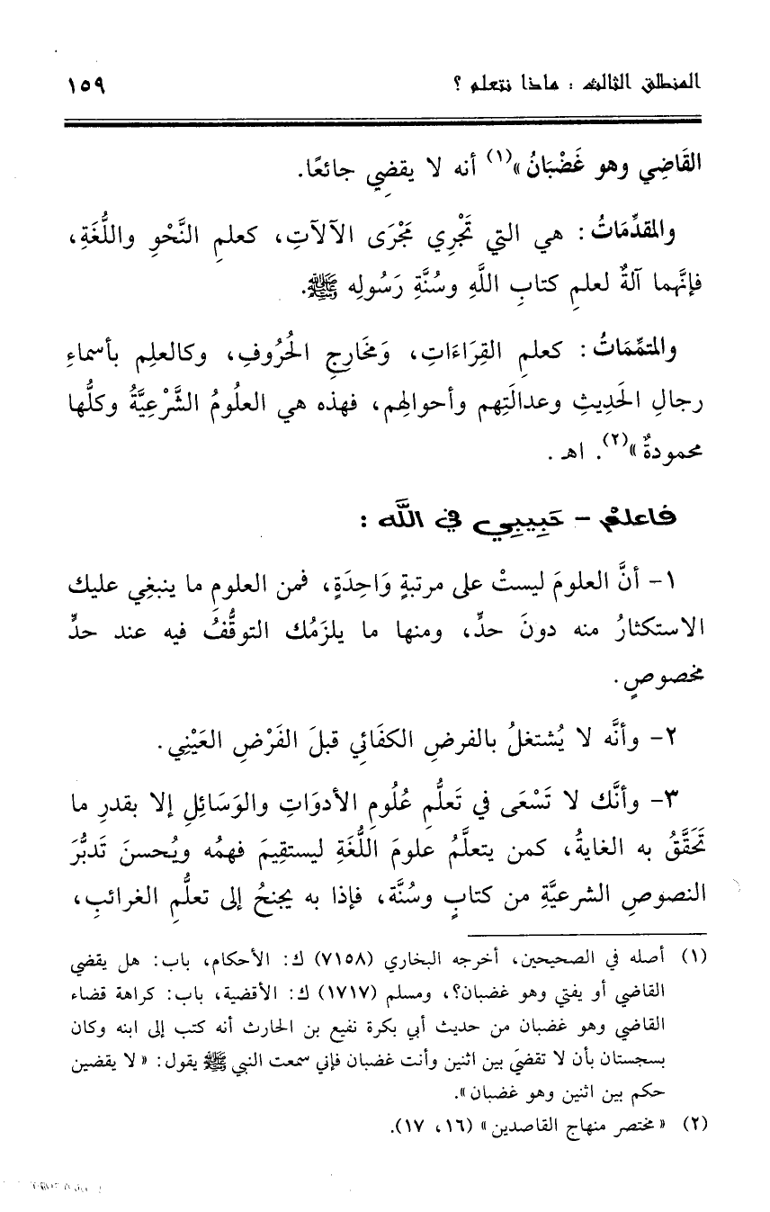 فاعلم ـ حبيبي في الله ـ أنَّ العلوم ليست على مرتبة واحدة، فمن العلوم ما ينبغي عليك الاستكثار منه دون حد، ومنها ما يلزمك التوقف فيه عند حد مخصوص، وأنَّه لا يشتغل بالفرض الكفائي قبل الفرض العيني، وأنَّك لا تسعى في تعلم علوم الأدوات والوسائل إلا بقدر ما تحقق به الغاية، كمن يتعلم علوم اللغة ليستقيم فهمه ويحسن تدبر النصوص الشرعية من كتاب وسنة فإذا به يجنح إلى تعلم الغرائب،