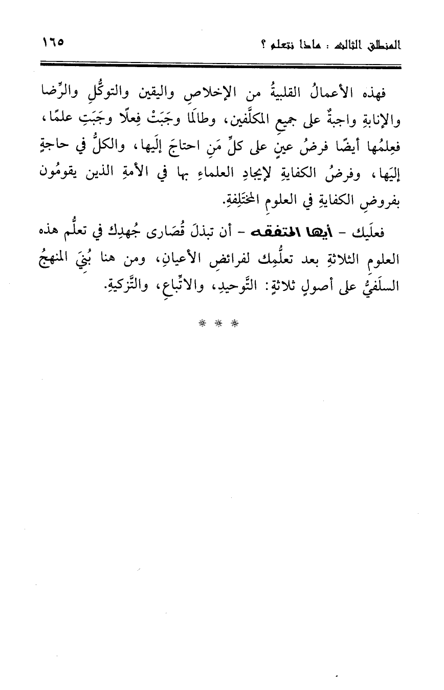 فعليك ـ أيها المتفقه ـ أنْ تبذل قصارى جهدك في تعلم هذه العلوم الثلاثة بعد تعلمك لفرائض الأعيان، ومن هنا بني المنهج السلفي على أصول ثلاثة: التوحيد، والاتباع، والتزكية.