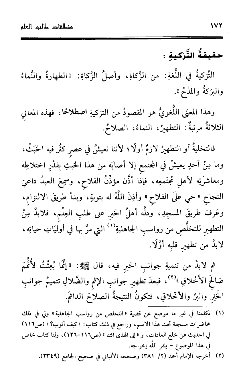 فالتخلية أو التطهير لازم أولاً؛ لأننا نعيش في عصر كثر فيه الخبث، وما من أحد يعيش في المجتمع إلا أصابه من هذا الخبث بقدر اختلاطه ومعاشرته لأهل ... مجتمعه، فإذا أذَّن مؤذن الفلاح، وسمع العبد داعي النجاح " حي على الفلاح " وأذن الله له بتوبة، وبدأ طريق الالتزام، وعرف طريق المسجد، ودله أهل الخير على طلب العلم، فلا بد من التطهير للتخلص من رواسب الجاهلية (¬1) التي مر بها في أوليات حياته، لا بد من تطهير قلبه أولاً. .