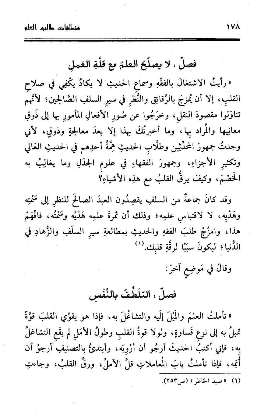 رأيت الاشتغال بالفقه وسماع الحديث لا يكاد يكفي في صلاح القلب، إلا أن يمزج بالرقائق والنظر في سير السلف الصالحين؛ لأنهم تناولوا مقصود النقل، وخرجوا عن صور الأفعال المأمور بها إلى ذوق معانيها والمراد بها، وما أخبرتك بهذا إلا بعد معالجة وذوق لأني وجدت جمهور المحدثين وطلاب الحديث همة أحدهم في الحديث العالي وتكثير الأجزاء.