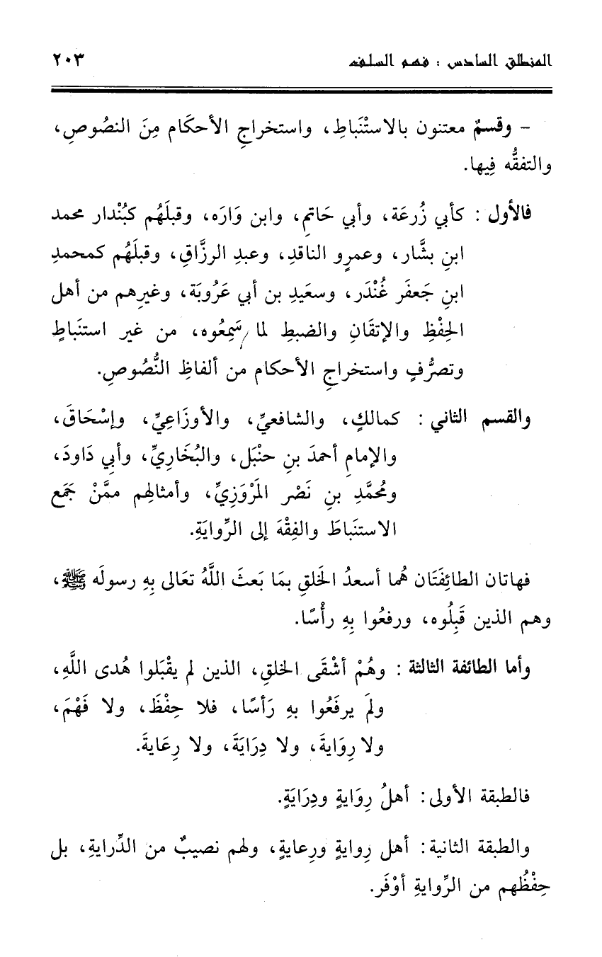 فالأول: كأبي زرعة، وأبى حاتم، وابن وارة، وقبلهم كبندار محمد بن بشار، وعمرو الناقد، وعبد الرزاق، وقبلهم كمحمد بن جعفر غندر، وسعيد بن أبي عروبة، وغيرهم من أهل الحفظ والإتقان، والضبط لما سمعوه، من غير استنباط وتصرف واستخراج الأحكام من ألفاظ النصوص.