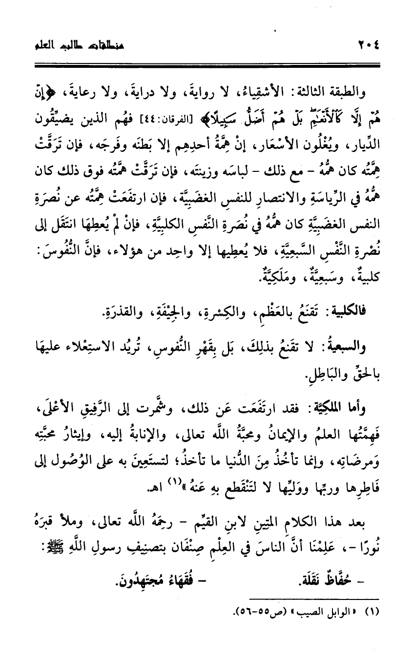 والطبقة الثالثة: الأشقياء، لا رواية، ولا دراية، ولا رعاية، " إن هم إلا كالأنعام بل هم أضل سبيلا " [الفرقان /44] فهم الذين يضيقون الديار، ويغلون الأسعار، إنْ همة أحدهم إلا بطنه وفرجه، فإن ترقت همته كان همه ـ مع ذلك ـ لباسه وزينته، فإن ترقت همته فوق ذلك كان همه في الرياسة والانتصار للنفس الغضبية، فإن ارتفعت همته عن نصرة النفس الغضبية كان همه في نصرة النفس الكلبية، فإن لم يعطها انتقل إلى نصرة النفس السبعية، فلا يعطيها إلا واحد من هؤلاء فإنَّ النفوس: كلبية، وسبعية، وملكية.