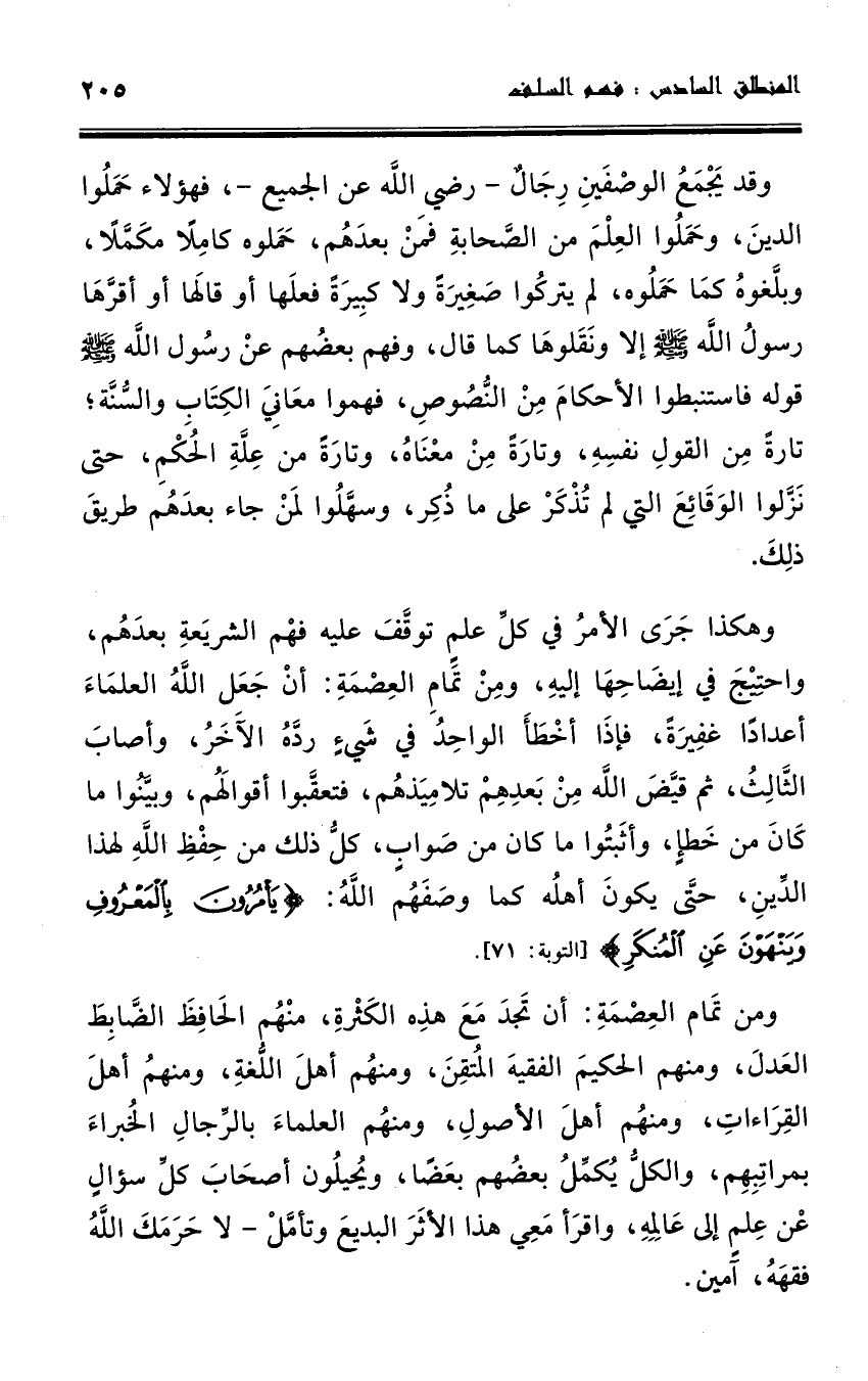 وهكذا جرى الأمر في كل علم توقف عليه فهم الشريعة بعدهم، واحتيج في إيضاحها إليه، ومن تمام العصمة أن جعل الله العلماء أعداداً غفيرة، فإذا أخطأ الواحد في شيء رده الآخر، وأصاب الثالث.، ثم قيض الله من بعدهم تلاميذهم، فتعقبوا أقوالهم، وبينوا ما كان من خطأ، وأثبتوا ما كان من صواب، كل ذلك من حفظ الله لذلك الدين، حتى يكون أهله كما وصفهم الله: " يأمرون بالمعروف وينهون عن المنكر" [التوبة/71]