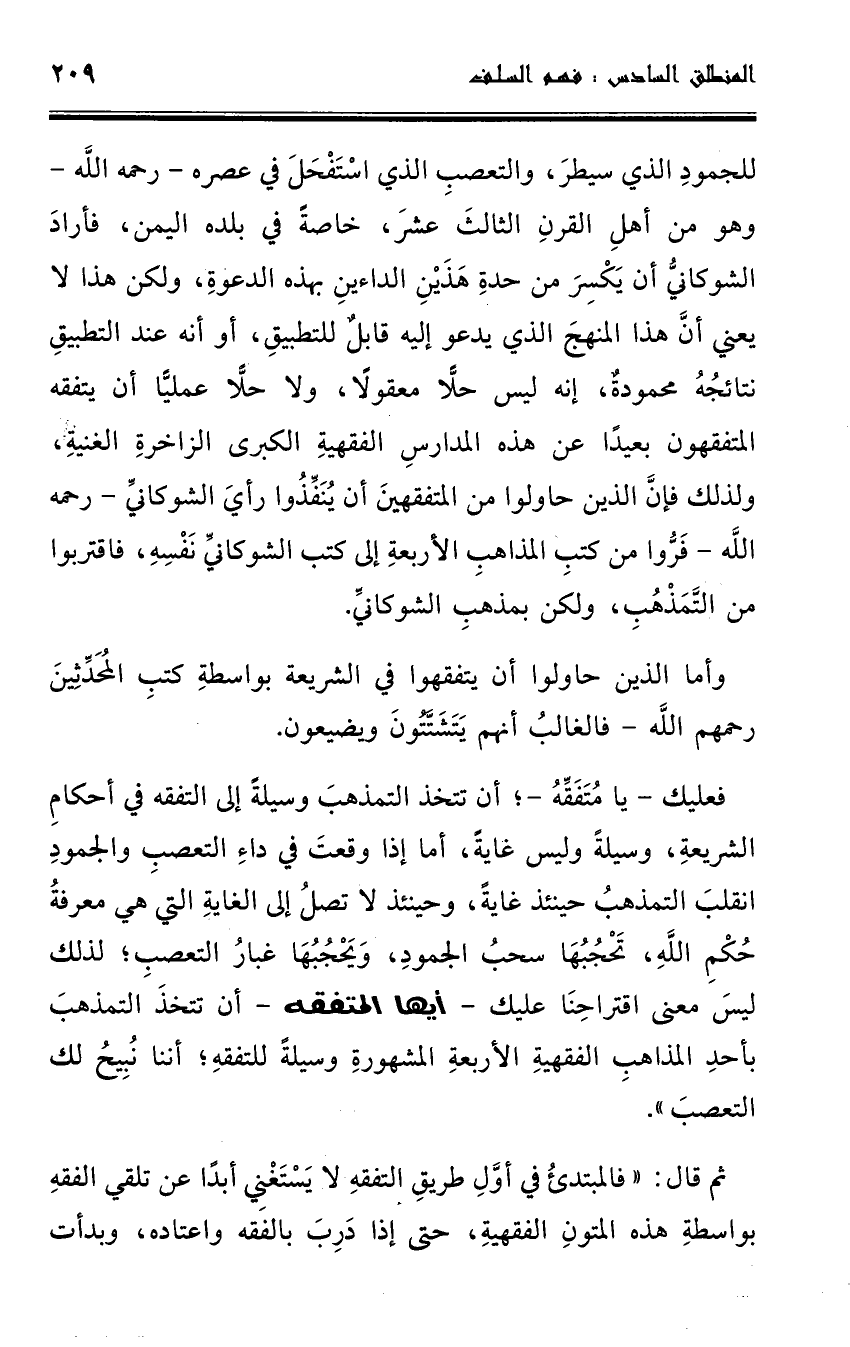 فعليك ـ يا متفقه ـ أن تتخذ التمذهب وسيلة إلى التفقه في أحكام الشريعة، وسيلة وليس غاية، أما إذا وقعت في داء التعصب والجمود، انقلب التمذهب حينئذ غاية، وحينئذ لا تصل إلى الغاية التي هي معرفة حكم الله، تحجبها سحب الجمود، ويحجبها غبار التعصب؛ لذلك ليس معنى اقتراحنا عليك ـ أيها المتفقه ـ أن تتخذ التمذهب بأحد المذاهب الفقهية الأربعة المشهورة وسيلة للتفقه، أننا نبيح لك التعصب "