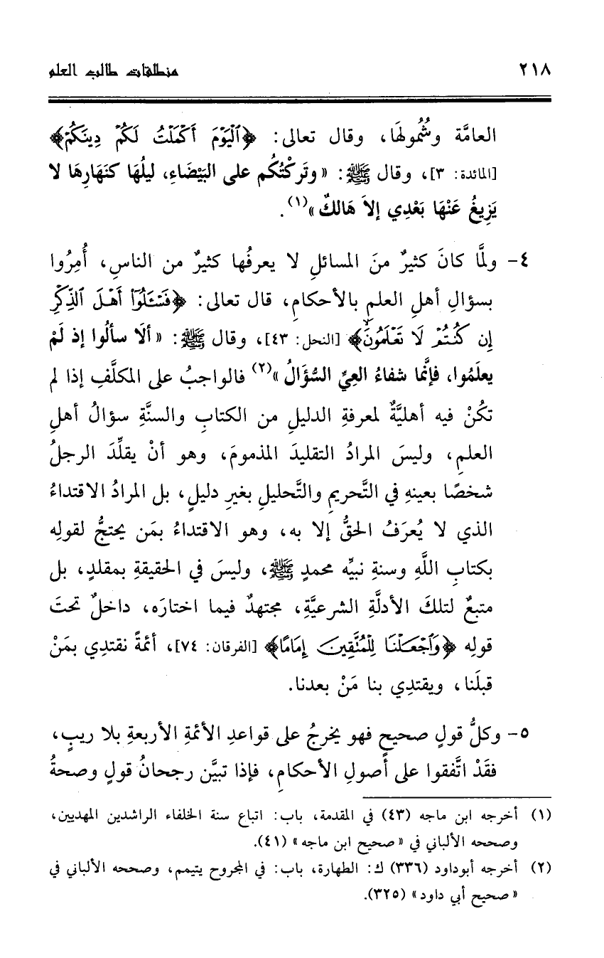 4) ولما كان كثير من المسائل لا يعرفها كثير من الناس، أمروا بسؤال أهل العلم بالأحكام، قال تعالى: " فاسألوا أهل الذكر إن كنتم لا تعلمون " [النحل /43]، وقال صلى الله عليه وسلم "ألا سألوا إذ لم يعلموا فإنما شفاء العي السؤال" (¬2)، فالواجب على المكلف إذ لم تكن فيه أهلية لمعرفة الدليل من الكتاب والسنة سؤال أهل العلم.، وليس المراد التقليد المذموم.، وهو أن يقلد الرجل شخصاً بعينه في التحريم والتحليل بغير دليل، بل المراد الاقتداء الذي لا يعرف الحق إلا به، وهو الاقتداء بمن يحتج لقوله بكتاب الله وسنة نبيه محمد صلى الله عليه وسلم، وليس في الحقيقة بمقلد، بل متبع لتلك الأدلة الشرعية، مجتهد فيما اختاره. داخل تحت قوله " واجعلنا للمتقين إماما " [الفرقان /74] ... أئمة نقتدي بمن قبلنا، ويقتدي بنا من بعدنا ..