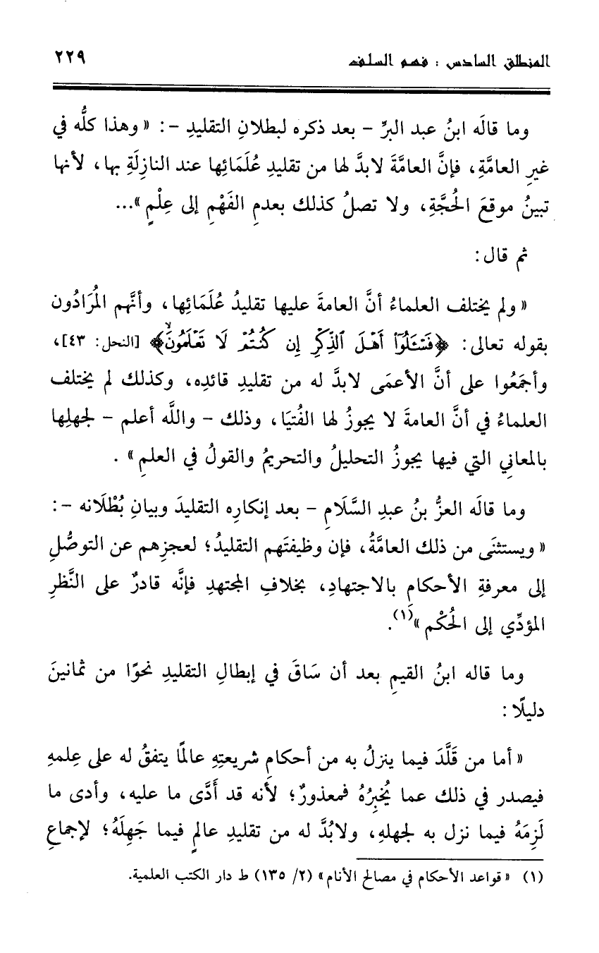 وما قاله ابن عبد البر ـ بعد ذكره لبطلان التقليد ـ: " وهذا كله في غير العامة، فإن العامة لا بد لها من تقليد علمائها عند النازلة بها، لأنها تبين موقع الحجة، ولا تصل كذلك بعدم الفهم إلى علم ... "