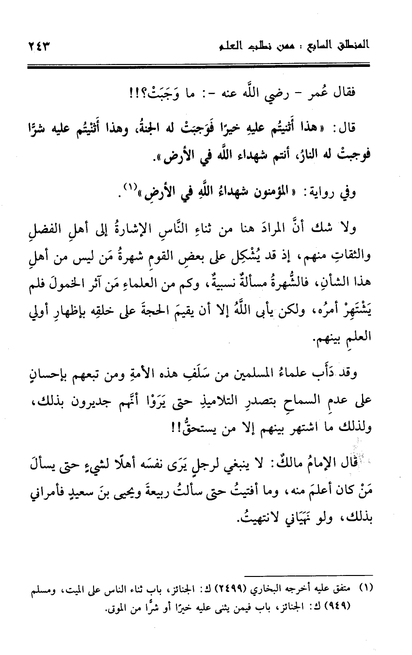 ولا شك أنَ المرادَ هنا من ثناءِ النَّاسِ الإشارةُ إلى أهلِ الفضلِ والثقاتِ منهم، إذ قد يُشْكِل على بعضِ القومِ شهرةُ مَن ليس من أهلِ هذا الشأنِ، فالشُّهرةُ مسألةٌ نسبيةٌ، وكم من العلماءِ مَن آثر الخمولَ فلم يَشْتَهِرْ أمرُه، ولكن يأبى اللهُ إلا أن يقيمَ الحجةَ على خلقِه بإظهارِ أولي العلمِ بينهم.