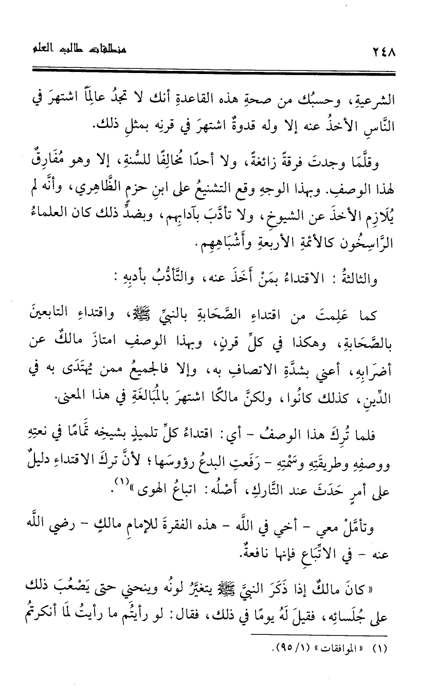 كما علمت من اقتداء الصحابة بالنبي صلى الله عليه وسلم، واقتداء التابعين بالصحابة، وهكذا في كل قرن، وبهذا الوصف امتاز مالك عن إضرابه، أعنى بشدة الاتصاف به، وإلا فالجميع ممن يهتدي به في الدين، كذلك كانوا، ولكن مالكًا اشتهر بالمبالغة في هذا المعنى ".