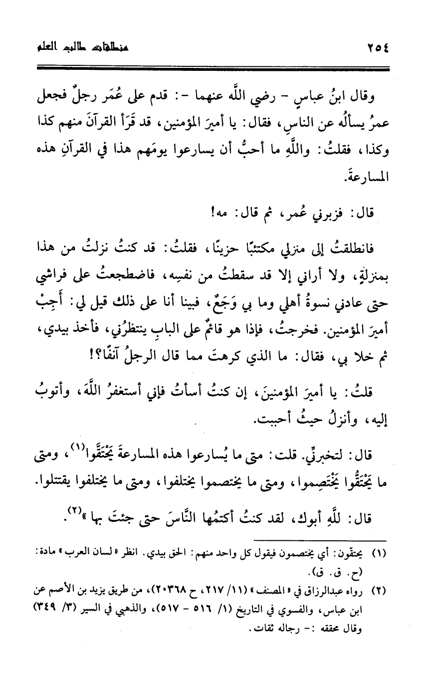 وقال ابنُ عباسٍ -رضي الله عنهما-: قدم على عُمَر رجلٌ فجعل عمرُ يسألُه عن الناسِ، فقال: يا أميرَ المؤمنين، قد قَرَأ القرآنَ منهم كذا وكذا، فقلتُ: واللهِ ما أحبُّ أن يسارعوا يومَهم هذا في القرآنِ هذه المسارعةَ.