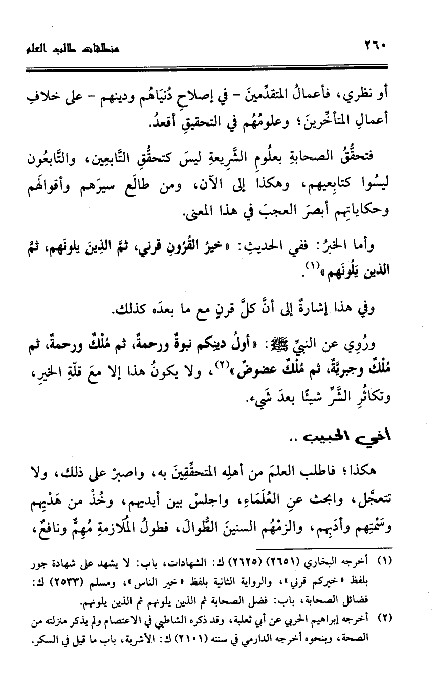 (¬1) أخرجه البخاري (2651) (2625) ك الشهادات، باب لا يشهد على شهادة جور بلفظ " خيركم قرني "، والرواية الثانية بلفظ " خير الناس "، ومسلم (2533) ك فضائل الصحابة، باب فضل الصحابة ثم الذين يلونهم ثم الذين يلونهم.
