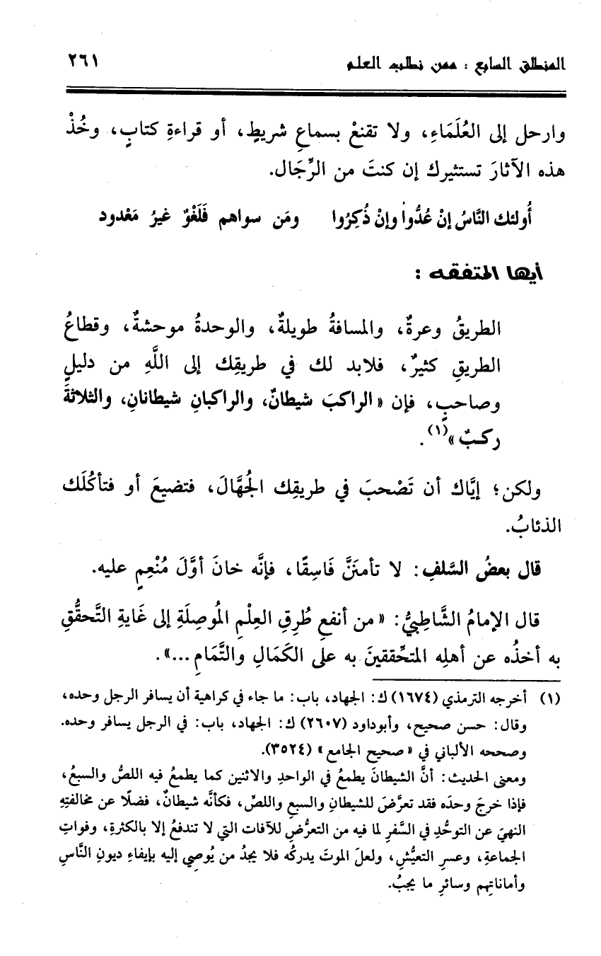 (¬1) أخرجه الترمذي (1674) ك الجهاد، باب ما جاء في كراهية أن يسافر الرجل وحده، وقال: حسن صحيح، وأبو داود (2607) ك الجهاد، باب في الرجل يسافر وحده.، وصححه الألباني في صحيح الجامع (3524)