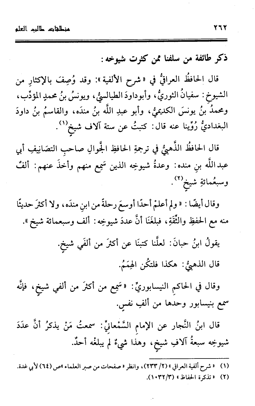 قال الحافظ الذهبي في ترجمة الحافظ الجوال صاحب التصانيف أبي عبد الله بن منده: وعدَّة شيوخه الذين سمع منهم وأخذ عنهم: ألفٌ وسبعُ مئة شيخ (¬2).