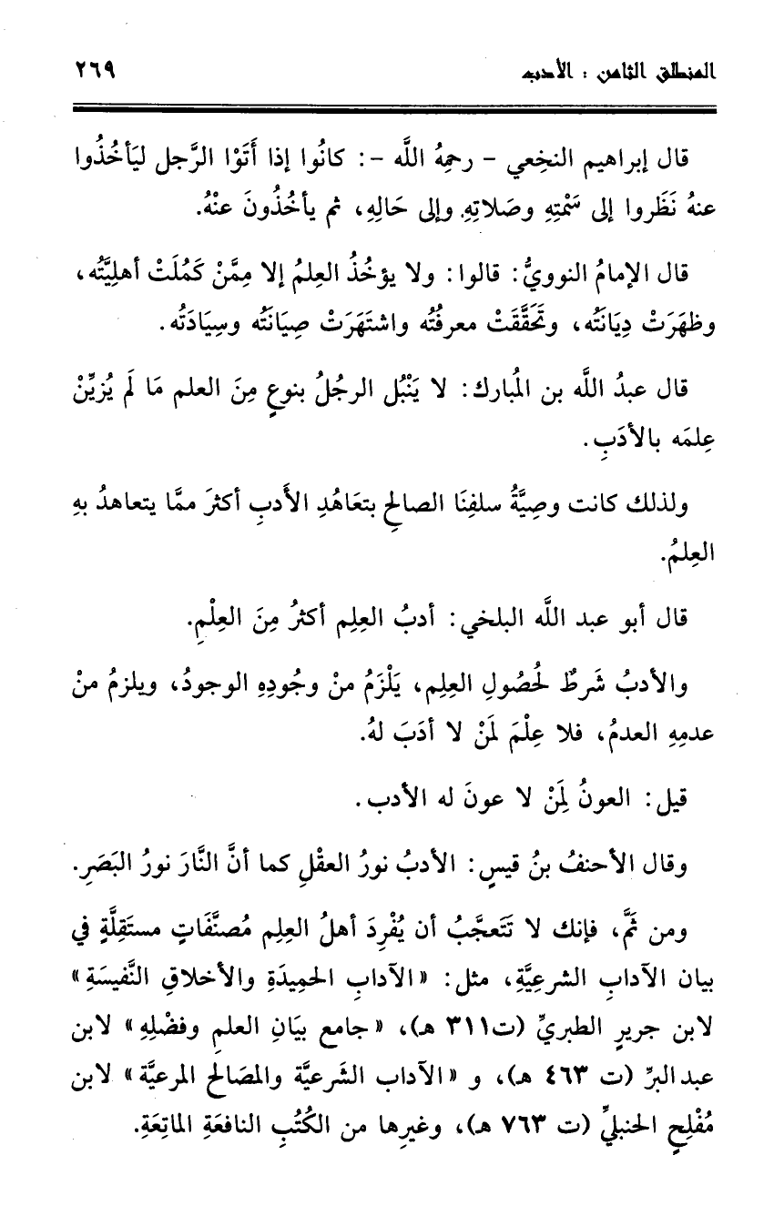 ومن ثمَّ فإنك لا تتعجب أن يفرد أهل العلم مصنفات مستقلة في بيان الآداب الشرعية، " مثل: الآداب الحميدة والأخلاق النفيسة لابن جرير الطبري ... (ت 311هـ)، " جامع بيان العلم وفضله " لابن عبد البر (ت 463هـ)، ... و" الآداب الشرعية والمصالح المرعية " لابن مفلح الحنبلي (ت 763هـ) وغيرها من الكتب النافعة الماتعة.