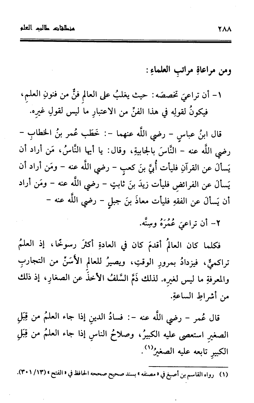 قال عُمر -رضي الله عنه-: فسادُ الدينِ إذا جاء العلمُ من قِبَلِ الصغيرِ استعصى عليه الكبيرُ، وصلاحُ الناسِ إذا جاء العلمُ من قِبَلِ الكبيرِ تابعه عليه الصغيرُ (¬1).