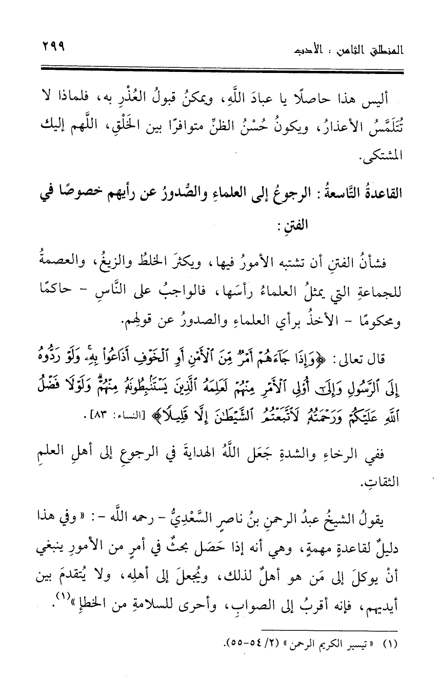 القاعدةُ التَّاسعةُ: الرجوعُ إلى العلماءِ والصُّدورُ عن رأيهم خصوصًا في الفتنِ: