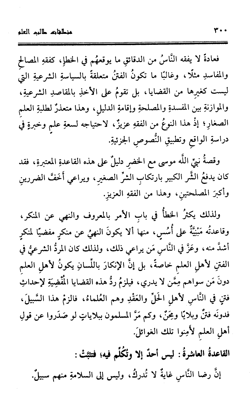 ولذلك يكثرُ الخطأُ في بابِ الأمر بالمعروف والنهي عن المنكر، وقاعدتُه مَبْنِيَّةٌ على أُسُسٍ، منها ألا يكونَ النهيُ عن منكرٍ مفضيًا لمنكرٍ أشدَّ منه، وعَزَّ في النَّاسِ مَن يراعي ذلك، ولذلك كان المردُّ الشرعيُّ في الفتنِ لأهلِ العلمِ خاصةً، بل إنَ الإنكارَ باللِّسانِ يكونُ لأهلِ العلمِ دونَ مَن سواهم مِمَّن لا يدري، فيلزمُ ردُّ هذه القضايا المُفضِيَةِ لإحداثِ فتنٍ في النَّاسِ لأهلِ الحَلِّ والعَقْدِ وهم العُلماءُ، فالزمْ هذا السَّبيلَ، فدونَه فتنٌ وبلايًا ومِحَنٌ، وكم مَرَّ المسلمون ببلاياتٍ لو صَدَروا عن قولِ أهلِ العلمِ لأَمِنوا تلك الغوائلَ.