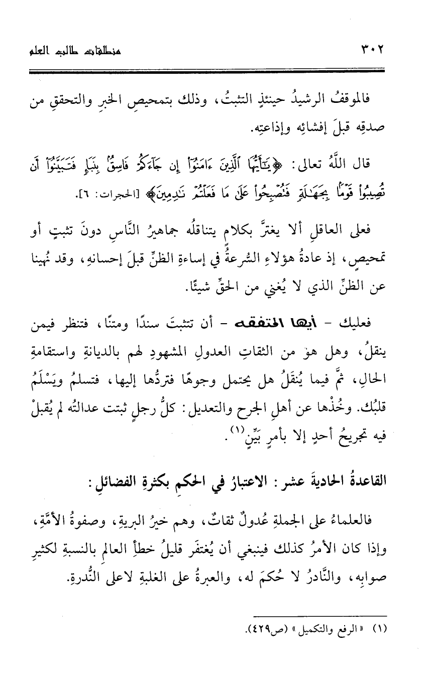 فعليك -أيها المتفقه- أن تتثبتَ سندًا ومتنًا، فتنظر فيمن ينقلُ، وهل هو من الثقاتِ العدولِ المشهودِ لهم بالديانةِ واستقامةِ الحالِ، ثمَّ فيما يُنقَلُ هل يحتمل وجوهًا فتردُّها إليها، فتسلمُ ويَسْلَمُ قلبُك. وخُذْها عن أهلِ الجرح والتعديل: كل رجلٍ ثبتت عدالتُه لم يُقبلْ فيه تجريحُ أحدٍ إلا بأمرٍ بَيَنٍ (¬1).