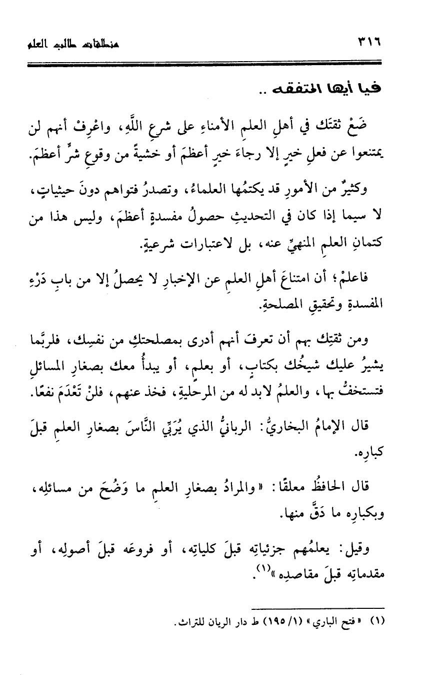 قال الإمام البخاريُّ: الربانيُّ الذي يُرَبِّي النَاسَ بصغارِ العلمِ قبلَ كبارِه.