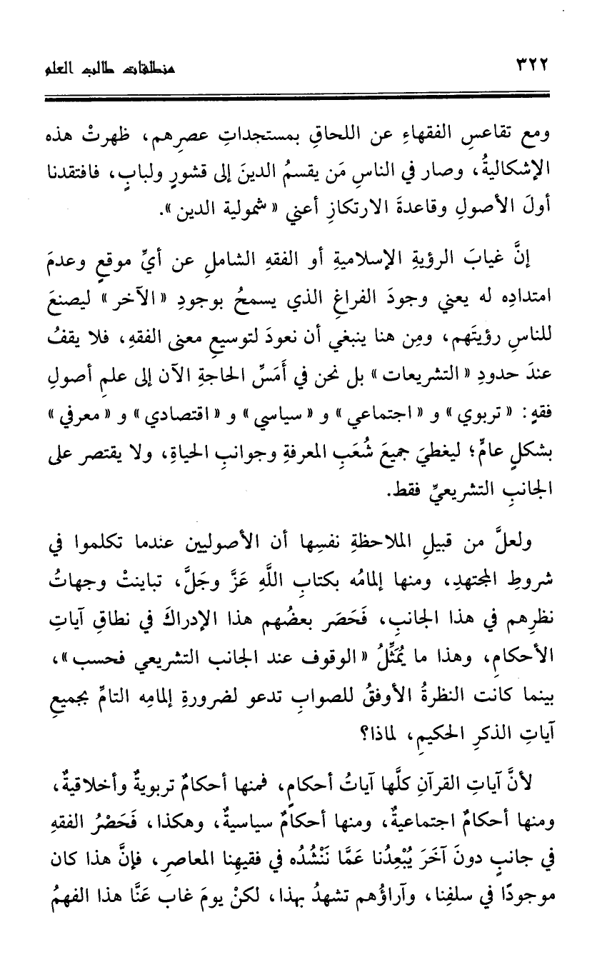إنَّ غياب الرؤية الإسلامية أو الفقه الشامل عن أي موقع وعدم امتداده له يعني وجود الفراغ الذي يسمح بوجود " الآخر " ليصنع للناس رؤيتهم، ومن هنا ينبغي أن نعود لتوسيع معنى الفقه، فلا يقف عند حدود " التشريعات " بل نحن في أمس الحاجة الآن إلى علم أصول فقه: " تربوي " و" اجتماعي " و" سياسي " ... و" اقتصادي " و" معرفي " بشكل عام؛ ليغطي جميع شعب المعرفة وجوانب الحياة، ولا يقتصر على الجانب التشريعي فقط.
