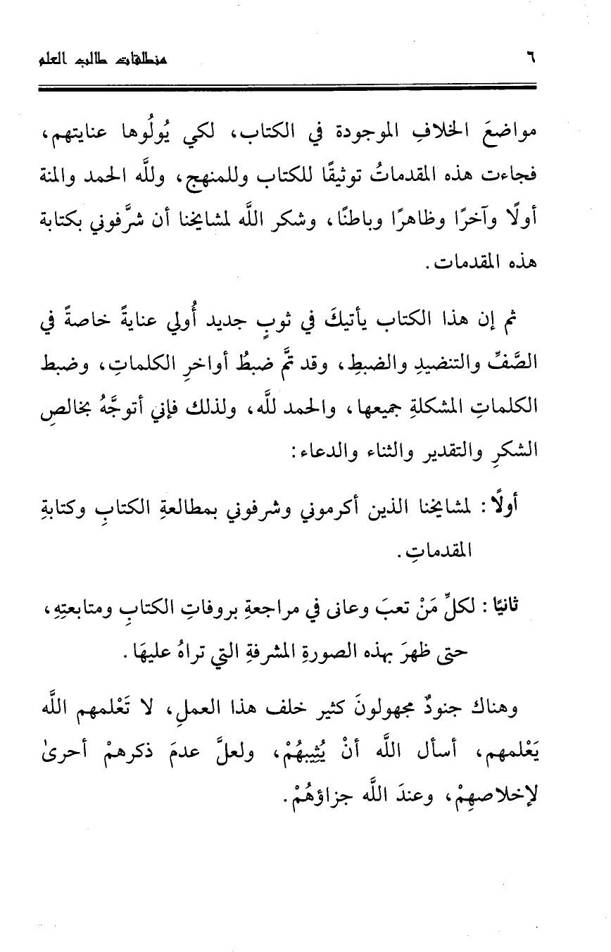 ثم إن هذا الكتاب يأتيكَ في ثوبٍ جديد أُولي عنايةً خاصةً في الصَّفِّ والتنضيدِ والضبطِ، وقد تَّم ضبطُ أواخرِ الكلماتِ، وضبط الكلماتِ المشكلةِ جميعها، والحمد لله، ولذلك فإني أتوجَّهُ بخالصِ الشكرِ والتقدير والثناء والدعاء: