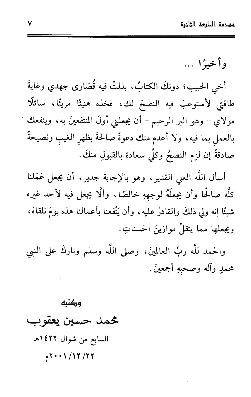 أخي الحبيب؛ دونكَ الكتابُ، بذلتُ فيه قُصَارى جهدي وغايةَ طاقتي لأستوعبَ فيه النصحَ لك، فخذه هنيئًا مريئًا، سائلًا مولاي -وهو البر الرحيم- أن يجعلني أولَ المنتفعينَ به، وينفعك بالعملِ بما فيه، ولا أعدم منك دعوةً صالحةَ بظهرِ الغيبِ ونصيحةً صادقةً إن لزم النصحُ وكلِّي سعادة بالقبولِ منكَ.