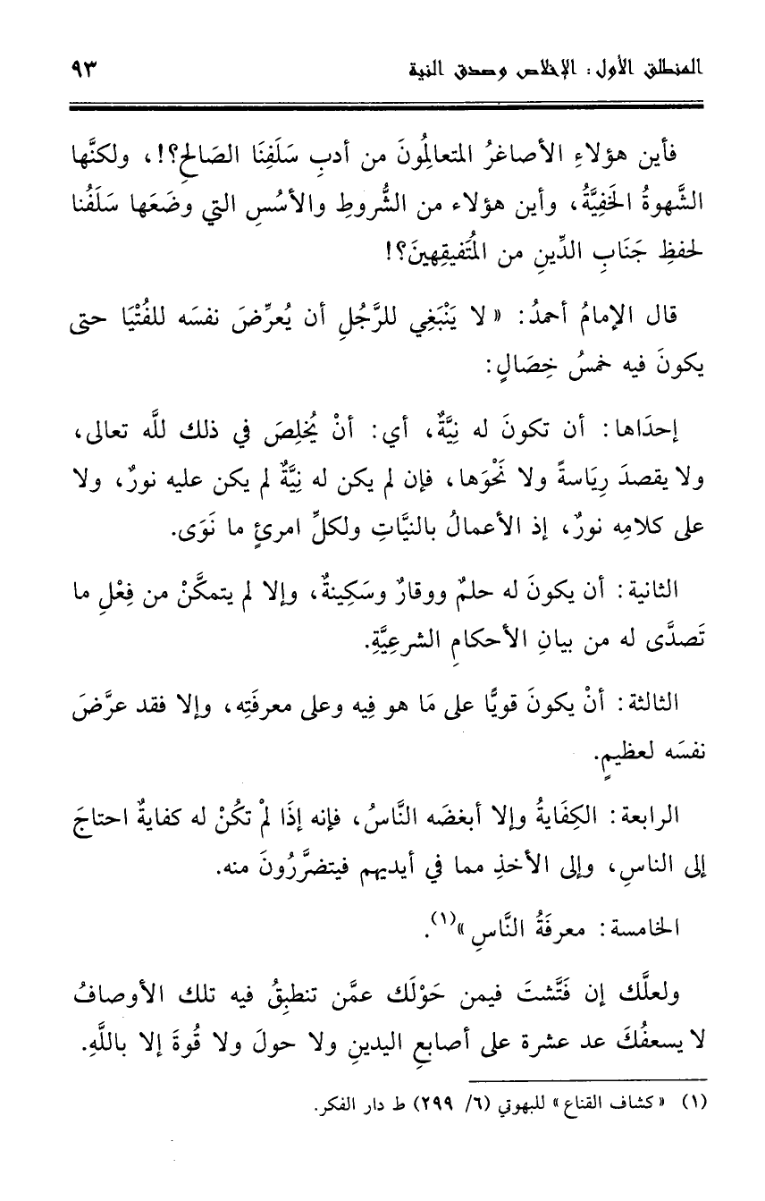 قال الإمام أحمد: " لا ينبغي للرجل أن يعرض نفسه للفتيا حتى يكون فيه خمس خصال: