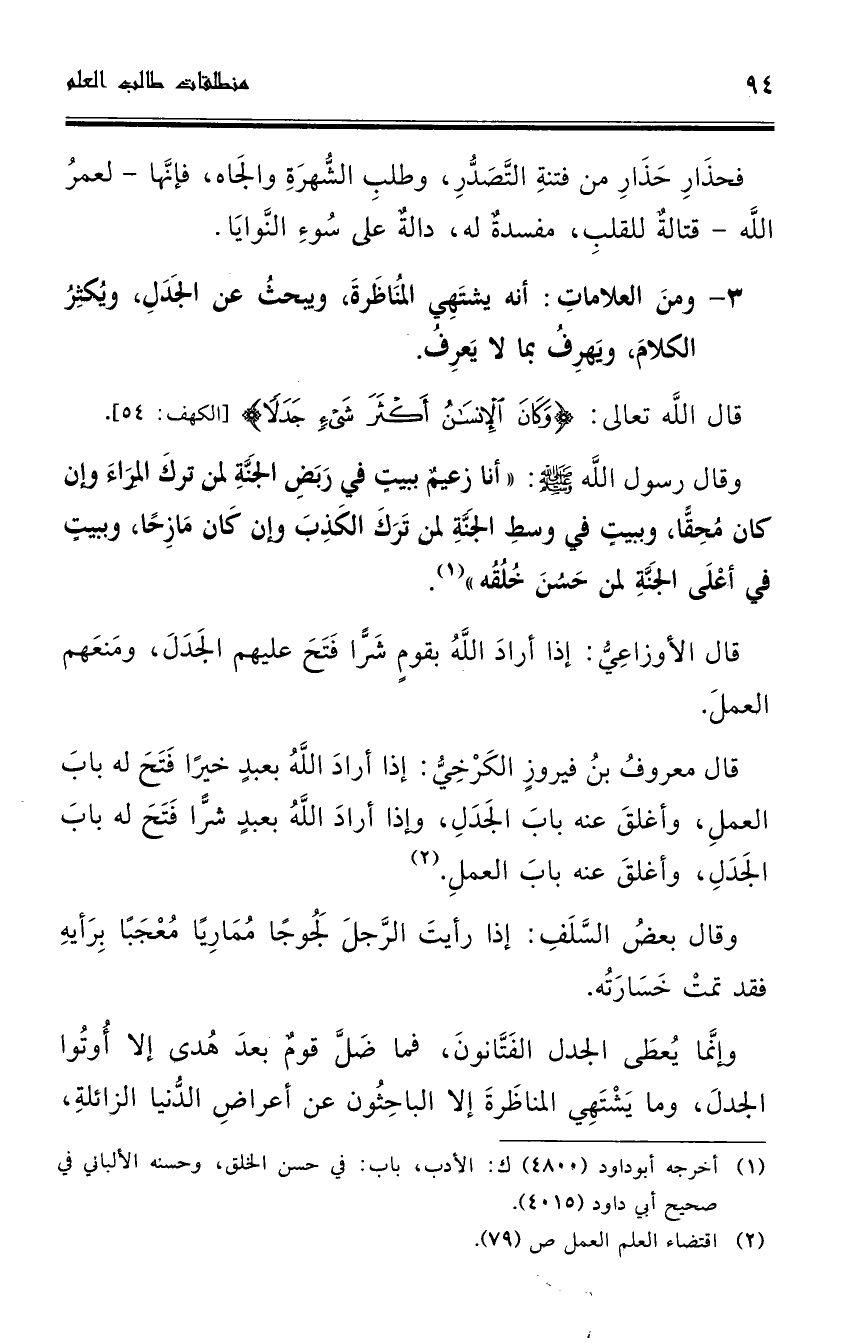وإنما يعطى الجدل الفتانون، فما ضل قوم بعد هدى إلا أوتوا الجدل، وما يشتهي المناظرة إلا الباحثون عن أعراض الدنيا الزائلة،