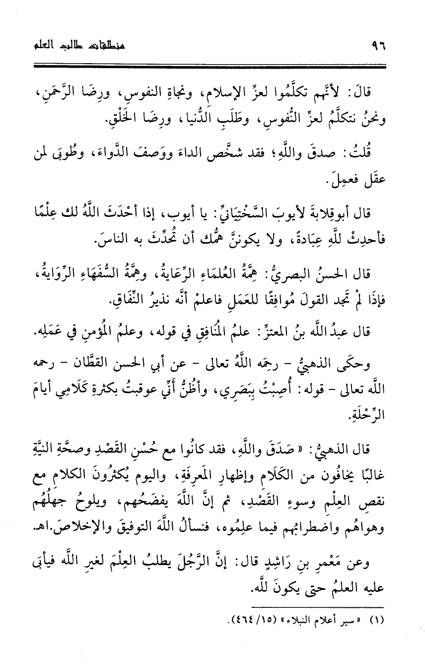 قال الذهبي: " صدق والله، فقد كانوا مع حسن القصد وصحة النية غالباً يخافون ... من الكلام، وإظهار المعرفة. واليوم يكثرون الكلام مع نقص العلم، ... وسوء القصد ثم إن الله يفضحهم، ويلوح جهلهم وهواهم واضطرابهم فيما علموه فنسأل الله التوفيق والإخلاص. أهـ