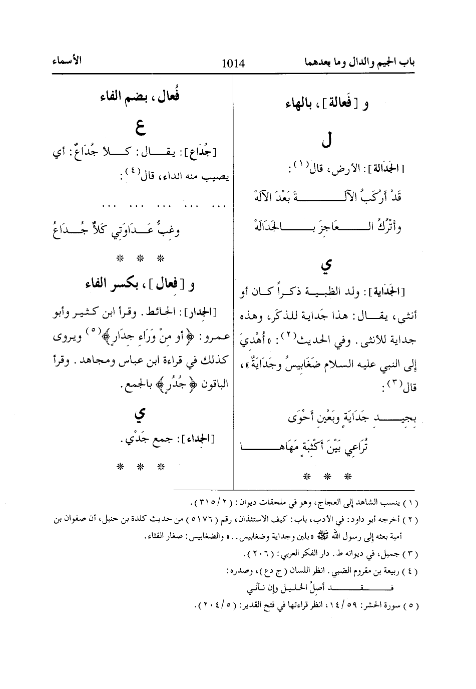 [جُدَاع]: يقال: كلأ جُدَاعٌ: أي يصيب منه الداء، قال «4»: