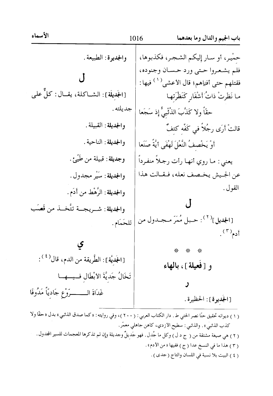 (2) هي صيغة مشتقة من (ج د ل) وكل ما جُدِلَ. فهو جَدِيلٌ وجديلة وإِن لم تذكرها المعجمات للسير المجدول.