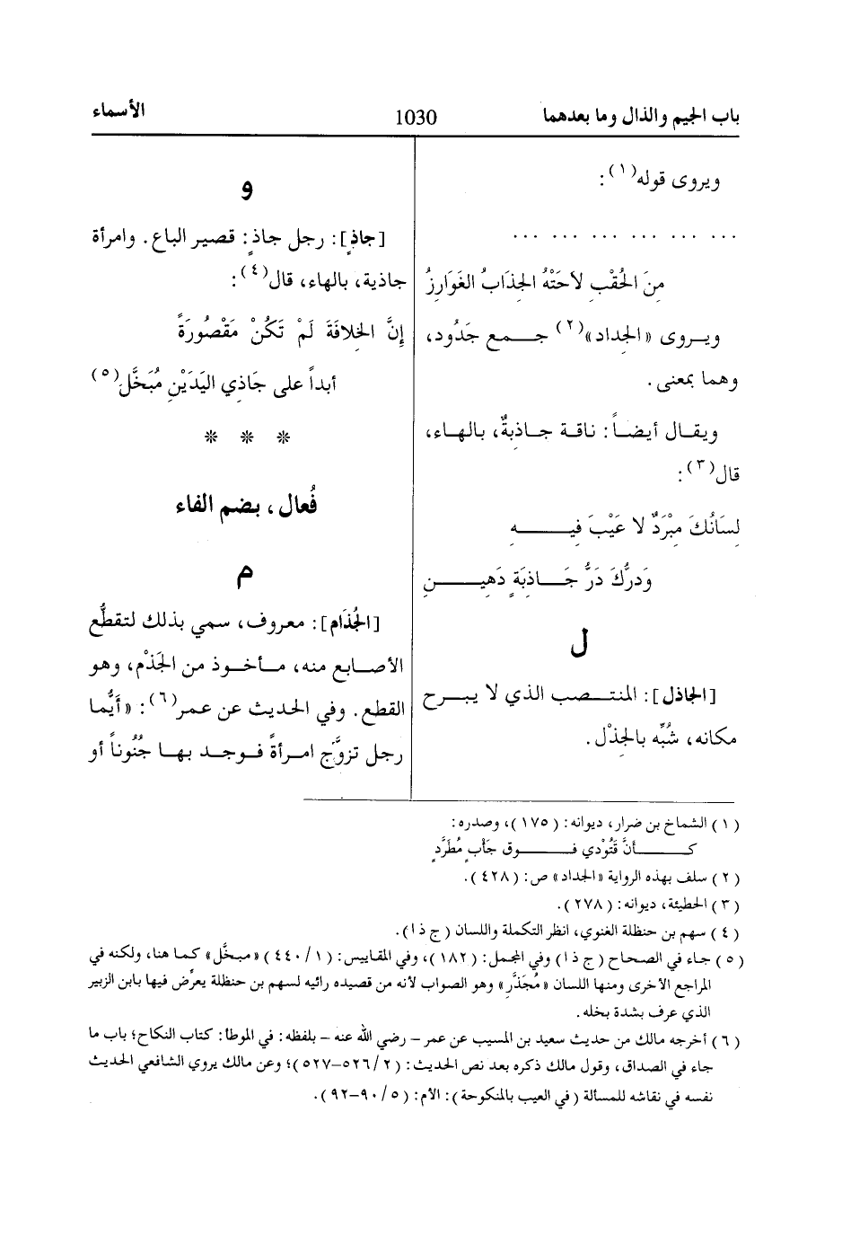(5) جاء في الصحاح (ج ذ ا) وفي المجمل: (182)، وفي المقاييس: (1/ 440) «مبخَّل» كما هنا، ولكنه في المراجع الأخرى ومنها اللسان «مُجَذَّرِ» وهو الصواب لأنه من قصيده رائيه لسهم بن حنظلة يعرِّض فيها بابن الزبير الذي عرف بشدة بخله.