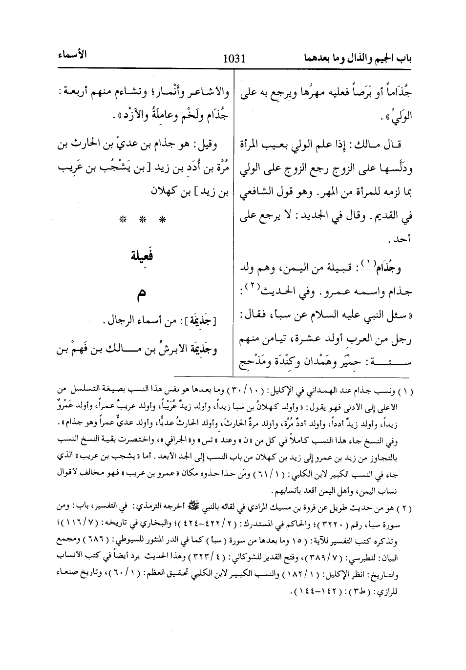 (1) ونسب جذام عند الهمداني في الإِكليل: (10/ 30) وما بعدها هو نفس هذا النسب بصيغة التسلسل من الأعلى إِلى الأدنى فهو يقول: «وأولد كهلانُ بن سبأ زيداً، وأولد زيدٌ عُرَيْباً، وأولد عريبٌ عمراً، وأولد عَمْروٌ زيداً، وأولد زيدٌ أدداً، وأولد أددٌ مُرَّة، وأولد مرةٌ الحارثَ، وأولد الحارثُ عديًّا، وأولد عديُّ عمراً وهو جذام».