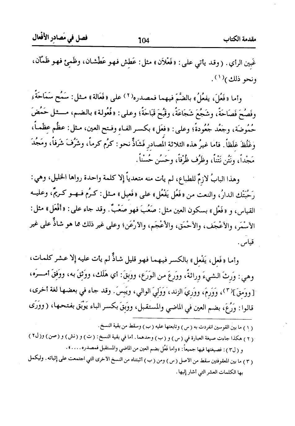 (2) هكذا جاءت صيغة العبارة في (س) و (ب) وحدهما. أما في بقية النسخ: (ت) و (نش) و (صن) و (ل 2) و (ل 3): فصيغتها فيها جميعاً: «وأما فَعُل بضم العين من الماضي والمستقبل فمصدره .... ».