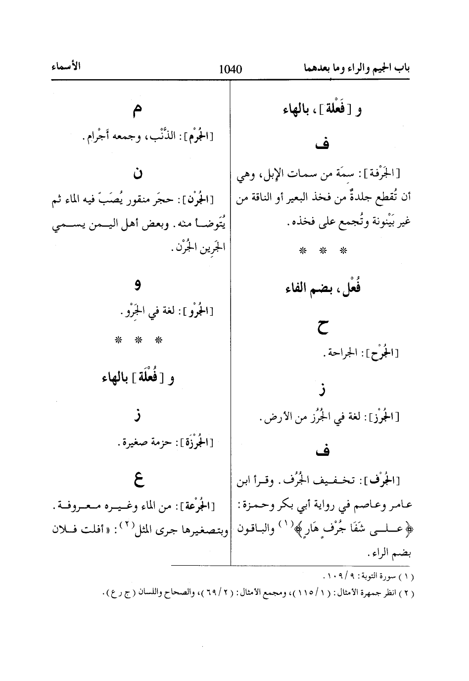 (2) انظر جمهرة الأمثال: (1/ 115)، ومجمع الأمثال: (2/ 69)، والصحاح واللسان (ج ر ع).