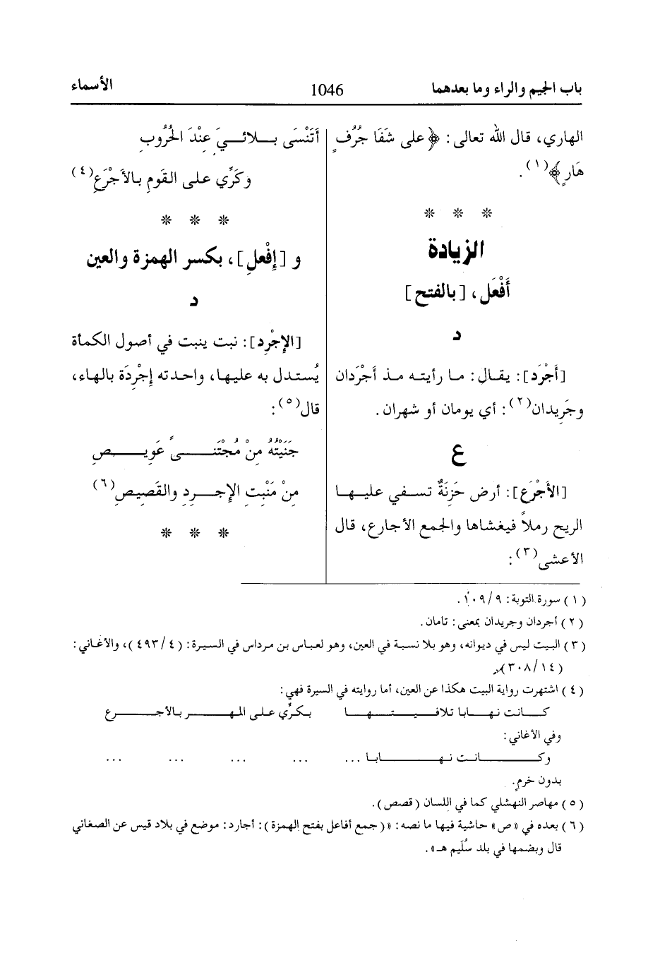 (6) بعده في «ص» حاشية فيها ما نصه: «(جمع أفاعل بفتح الهمزة): أجارد: موضع في بلاد قيس عن الصغاني قال وبضمها في بلد سليم هـ».