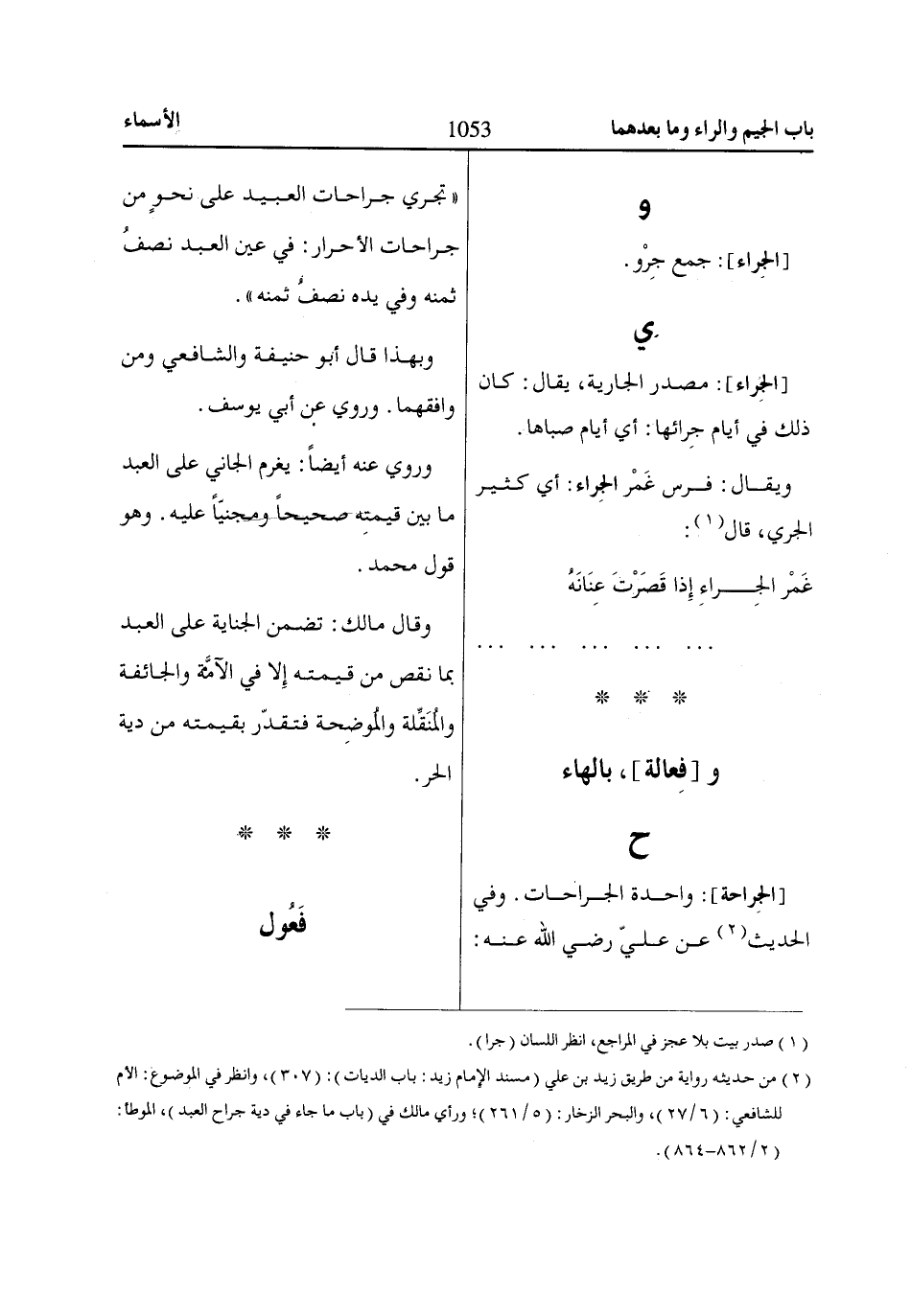 وفي الحديث «2» عن عليّ رضي اللّاه عنه: «تجري جراحات العبيد على نحوٍ من جراحات الأحرار: في عين العبد نصفُ ثمنه وفي يده نصفُ ثمنه»