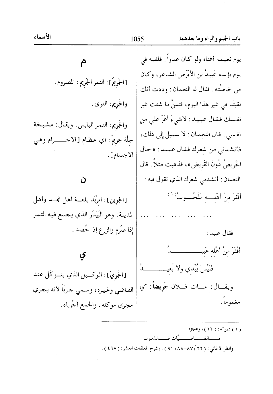 يوم نعيمه أغناه ولو كان عدواً. فلقيه في يوم بؤسه عَبِيدُ بن الأَبْرَص الشاعر، وكان من خاصَّته. فقال له النعمان: وددت أنك لقيتَنا في غير هذا اليوم، فتمنَّ ما شئت غير نفسك فقال عبيد: لا شيءَ أَعَزّ علي من نفسي. قال النعمان: لا سبيل إِلى ذلك، فأنشدني من شِعرك فقال عبيد: «حال الجَريضُ دُونَ القَرِيض»، فذهبت مثلًا. قال النعمان: أنشدني شعرك الذي تقول فيه: