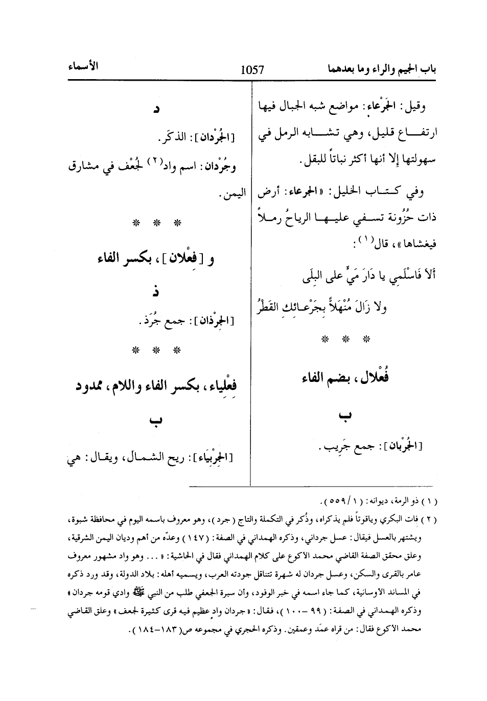 (2) فات البكري وياقوتاً فلم يذكراه، وذُكر في التكملة والتاج (جرد)، وهو معروف باسمه اليوم في محافظة شبوة، ويشتهر بالعسل فيقال: عسل جرداني، وذكره الهمداني في الصفة: (147) وعدّه من أهم وديان اليمن الشرقية، وعلق محقق الصفة القاضي محمد الأكوع على كلام الهمداني فقال في الحاشية: « ... وهو واد مشهور معروف عامر بالقرى والسكن، وعسل جردان له شهرة تتناقل جودته العرب، ويسميه أهله: بلاد الدولة، وقد ورد ذكره في المساند الأوسانية، كما جاء اسمه في خبر الوفود، وأن سبرة الجعفي طلب من النبي صَلى الله عَليه وسلم وادي قومه جردان» وذكره الهمداني في الصفة: (99 - 100)، فقال: «جردان وادٍ عظيم فيه قرى كثيرة لجعف» وعلق القاضي محمد الأكوع فقال: من قراه عمد وعمقين. وذكره الحجري في مجموعه ص (183 - 184).