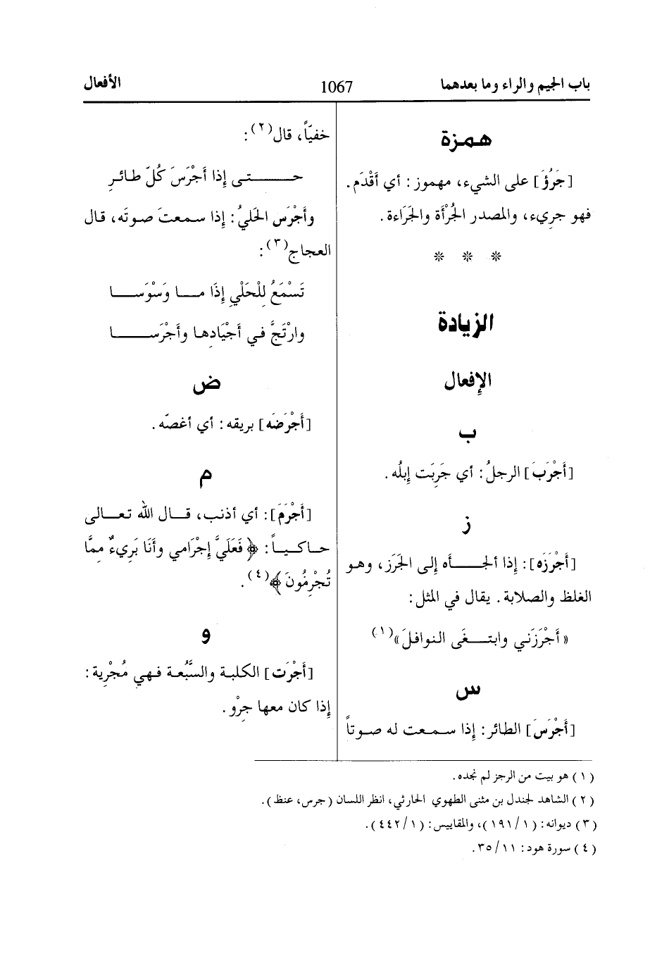 [أَجْرَمَ]: أي أذنب، قال اللّاه تعالى حاكياً: فَعَلَيَّ إِجْراامِي وَأَنَا بَرِيءٌ مِمّاا تُجْرِمُونَ «4».