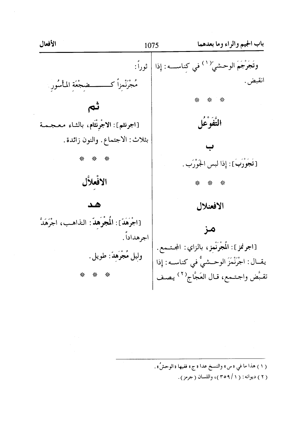يقال: اجْرَنْمَزَ الوحشيُّ في كناسه: إِذا تقبَّض واجتمع، قال العَجَّاج «2» يصف ثوراً: