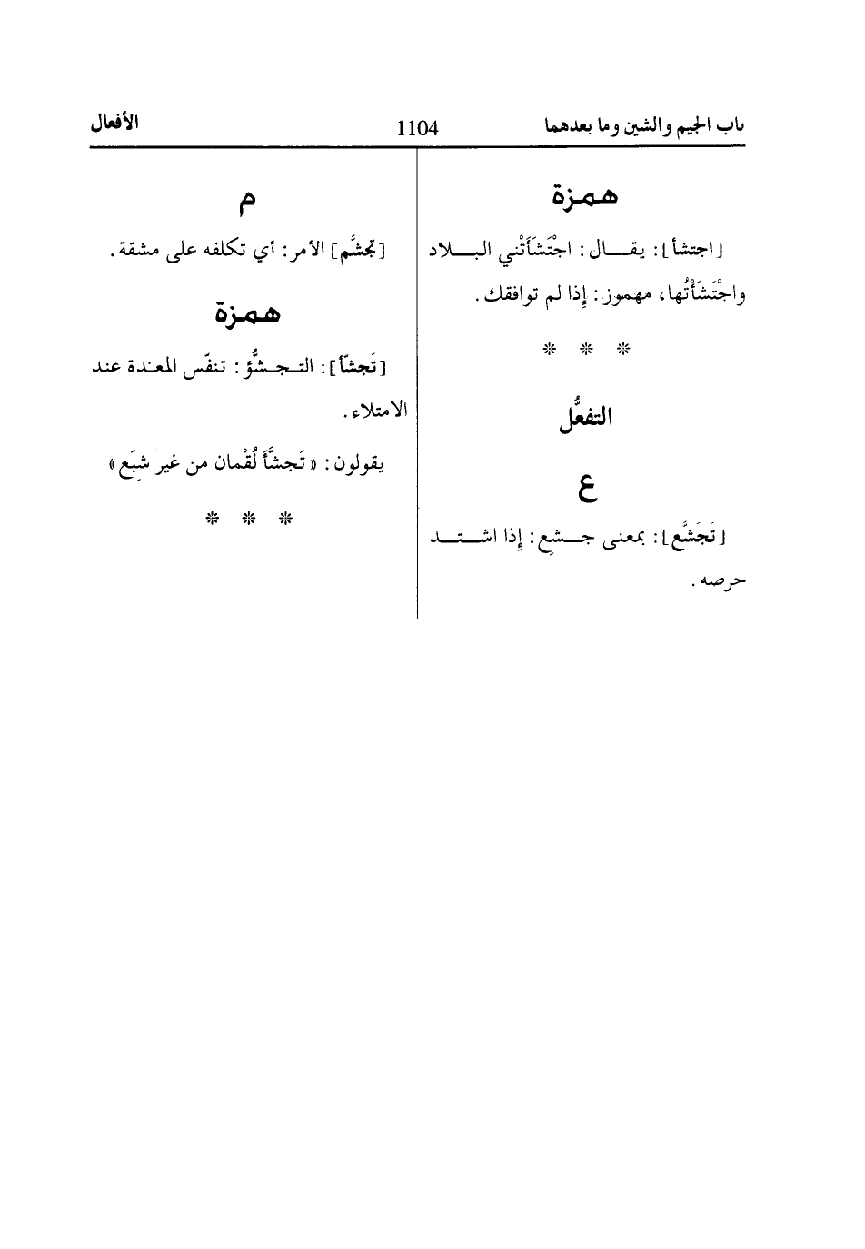 [اجتشأ]: يقال: اجْتَشَأَتْني البلاد واجْتَشَأْتُها، مهموز: إِذا لم توافقك.