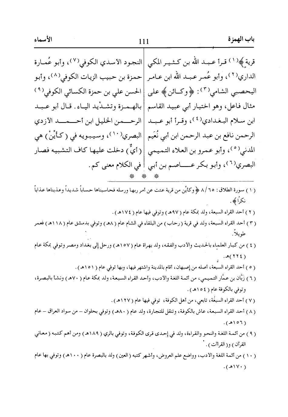 (9) من أئمة اللغة والنحو والقراءة، ولد في إِحدى قرى الكوفة، وتوفي بالري (189 هـ) ومن أهم كتبه (معاني القرآن) و (القراآت).