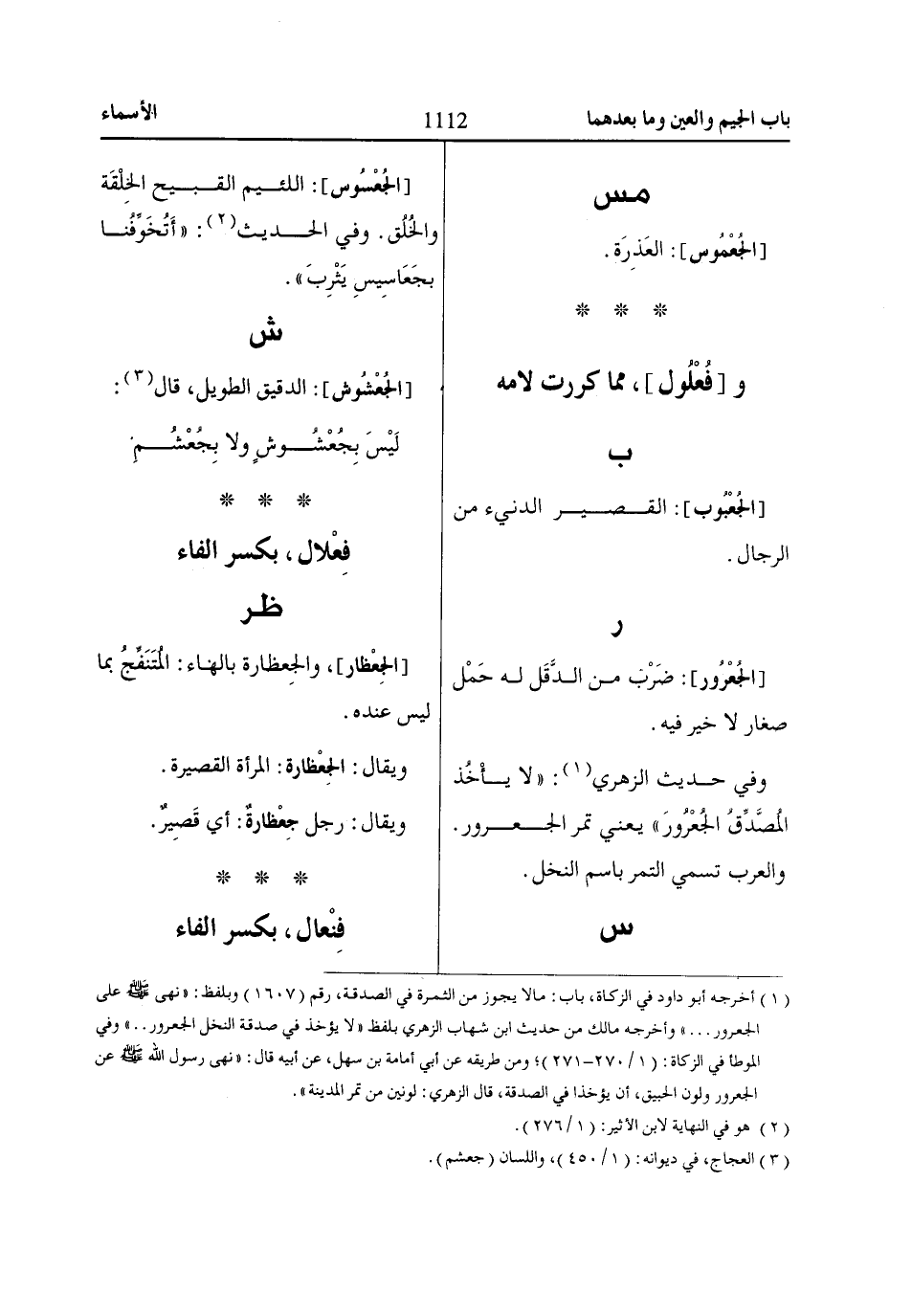 (1) أخرجه أبو داود في الزكاة، باب: ما لا يجوز من الثمرة في الصدقة، رقم (1607) وبلفظ: «نهى صَلى الله عَليه وسلم على الجعرور ... » وأخرجه مالك من حديث ابن شهاب الزهري بلفظ «لا يؤخذ في صدقة النخل الجعرور .. » وفي الموطأ في الزكاة: (1/ 270 - 271)؛ ومن طريقه عن أبي أمامة بن سهل، عن أبيه قال: «نهى رسول اللّاه صَلى الله عَليه وسلم عن الجعرور ولون الحبيق، أن يؤخذا في الصدقة، قال الزهري: لونين من تمر المدينة».
