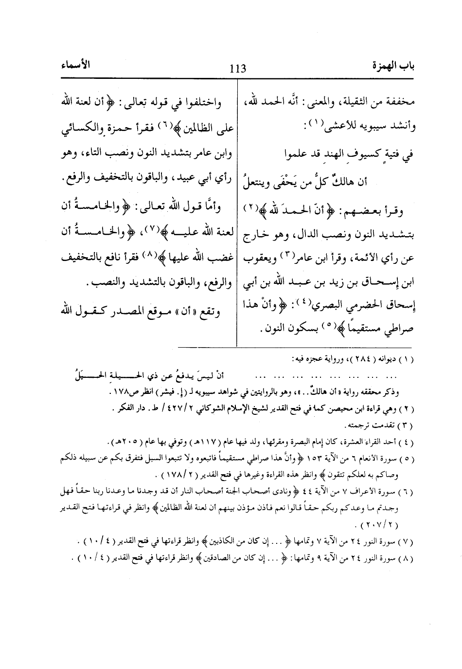 (7) سورة النور 24 من الآية 7 وتمامها ... إِنْ كاانَ مِنَ الْكااذِبِينَ وانظر قراءتها في فتح القدير (4/ 10).