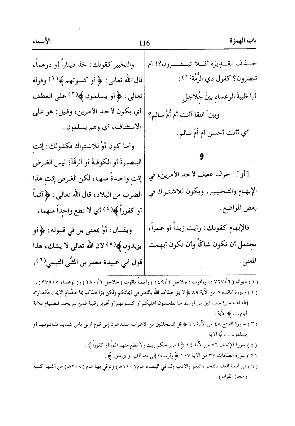 وأما كون أَوْ للاشتراك فكقولك: إِئتِ البصرةَ أو الكوفةَ أو الرقّةَ؛ ليس الغرض إِئتِ واحدةً منها، لكن الغرض إِئتِ هذا الضرب من البلاد، قال اللّاه تعالى: آثِماً أَوْ كَفُوراً «4» أي لا تطع واحداً منهما، ويقال: أَوْ بمعنى بل في قوله: أَوْ يَزِيدُونَ «5» لأن اللّاه تعالى لا يشك، هذا قول أبي عبيدة معمر بن المثنَّى التيمي «6»،