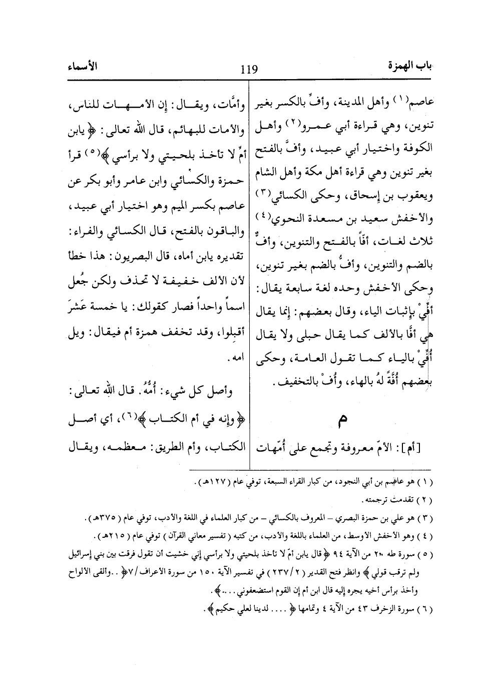 [أم]: الأمّ معروفة وتجمع على أُمّهات وأمَّات، ويقال: إِن الأمهات للناس، والأمات للبهائم، قال اللّاه تعالى: يَا بْنَ أُمَّ لاا تَأْخُذْ بِلِحْيَتِي وَلاا بِرَأْسِي «5» قرأ حمزة والكسائي وابن عامر وأبو بكر عن عاصم بكسر الميم وهو اختيار أبي عبيد، والباقون بالفتح، قال الكسائي والفراء: